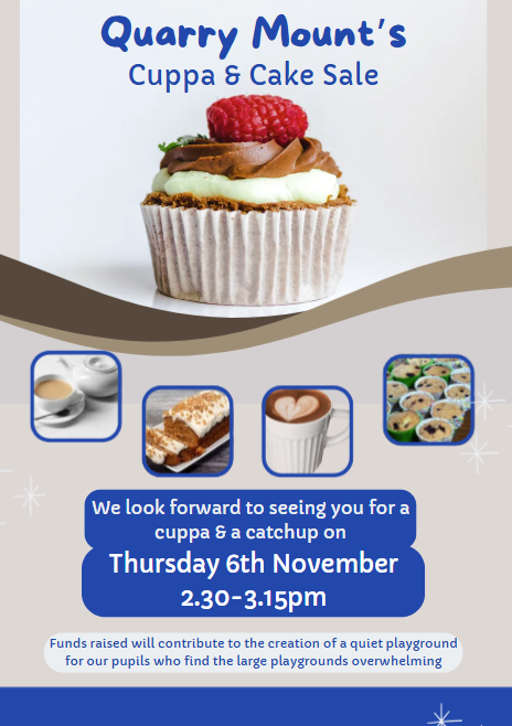 Parents & carers are invited to our half-termly Cuppa & Cake sale that is being held on Thursday 6th November from 2.30pm-3.15pm for this half-term. You can enjoy a drink and cake of your choice for £1 and the funds raised will contribute to the creation of a quiet playground for our pupils who find the large playgrounds overwhelming. We look forward to seeing you there!