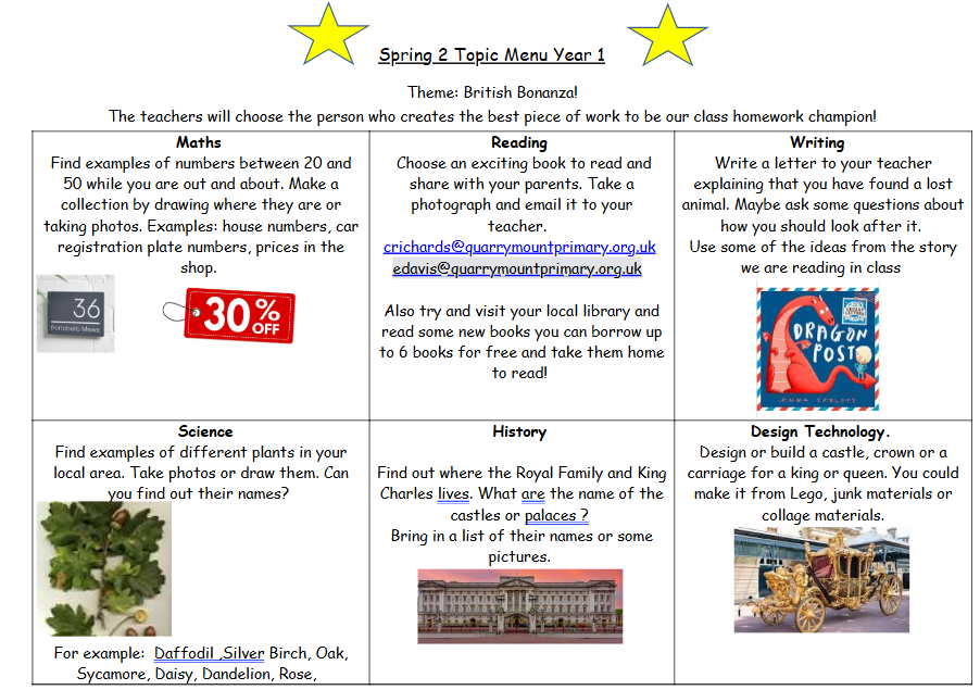 Homework will be given out on Fridays. This will be Maths or Phonics linked to the learning we have covered that week. You can also complete a more creative homework from our Homework Menus below.