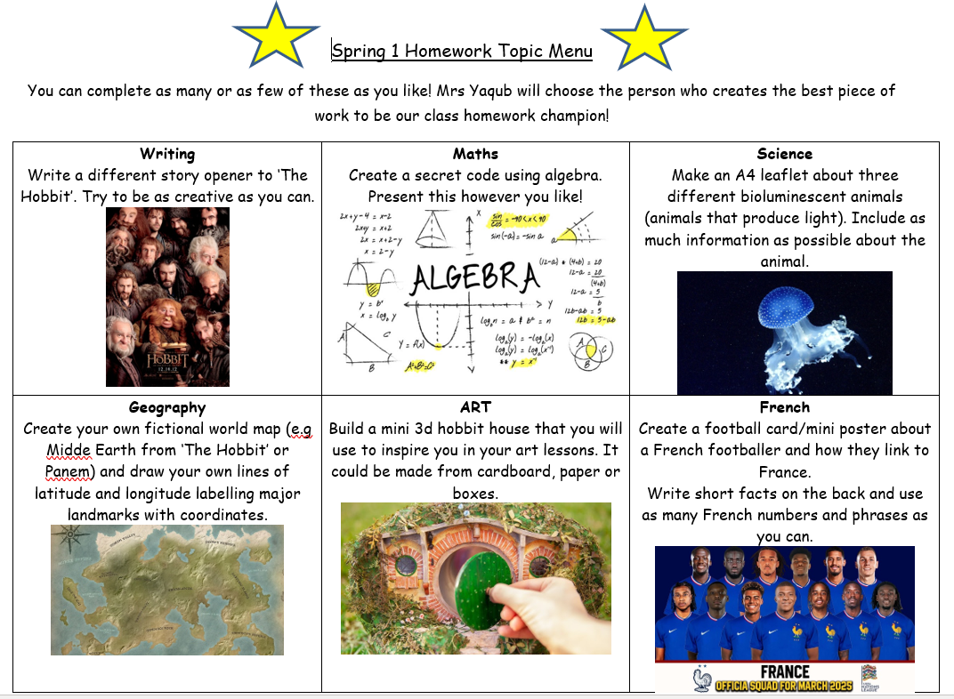 Year 6 can also choose to complete activities from the 'topic homework menu' below.